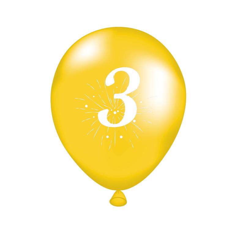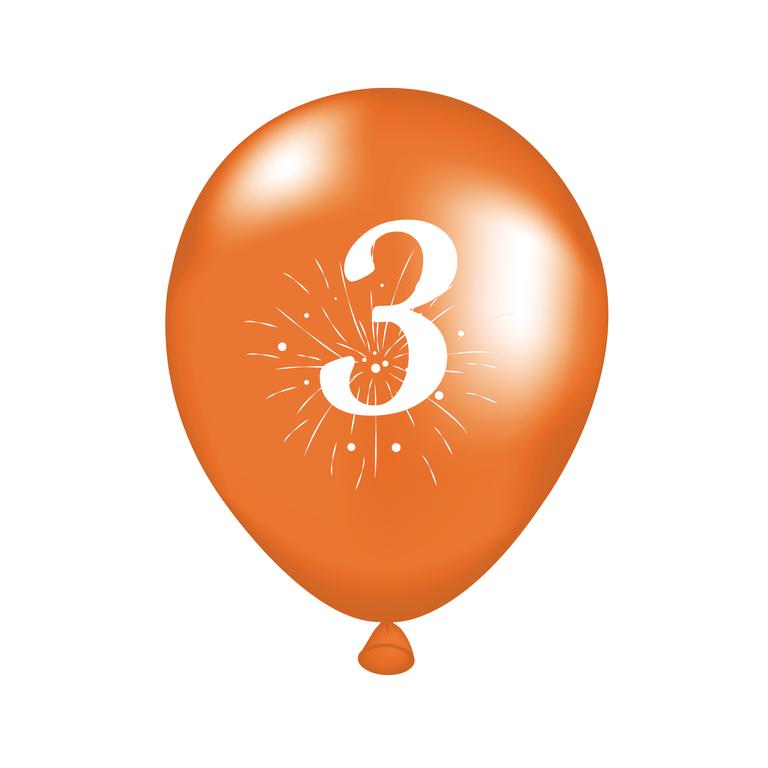 Párty balóniky s potlačou číslice 3 sú vhodné na oslavu narodenín či rôznych výročí. Balenie obsahuje 5 ks balónikov (2x oranžový, 2x zelený, 1x žltý), rozmery cca 25 cm (po nafúknutí). Balóniky nafukujte iba do primeraného rozmeru. Manipulácia detí s balónikmi by mala prebiehať len pod dozorom dospelej osoby. Skladujte pri teplotách nad 10 °C. Vyrobené z prírodného latexu.