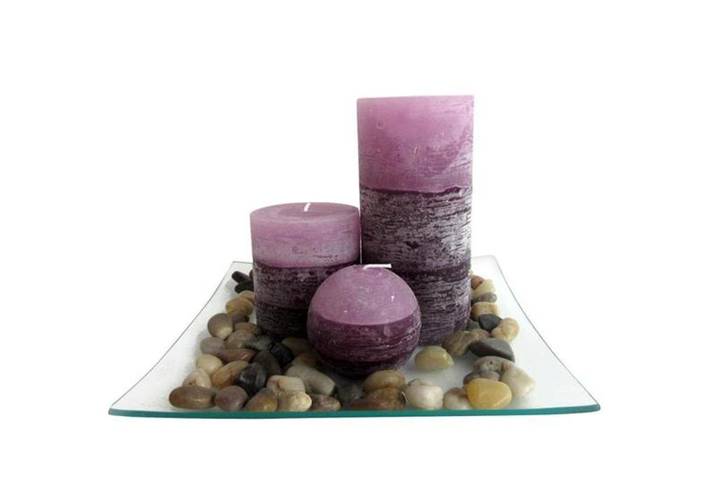 Darčekový set 3 ks sviečok s vôňou levandule na sklenenom podstavci s kamienkami je vhodný nielen ako darček, ale aj na dekoráciu a spríjemnenie chvíľ strávených doma. Materiál - parafín. Rozmery -