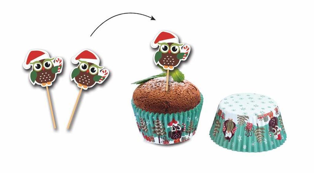 Formičky na muffiny - 24 ks + napichovadlá 24 ks. Vhodné na pečenie muffinov, s obľúbeným motívom vianočnej sovy. Materiál - papier, drevo.