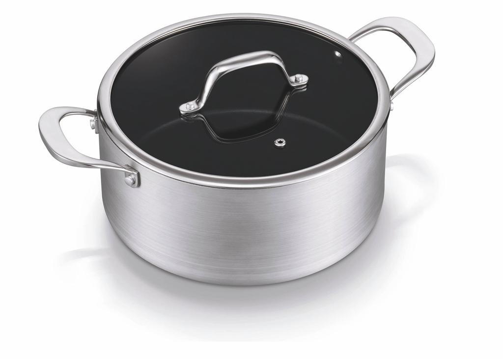 Kastról s pokrievkou Brabantia Technopro 24 cm, s objemom 4,5 l. Dvojvrstvové nepriľnavé vnútro kastróla sa ľahko čistí. Silná plne indukčná základňa zaistí lepšiu distribúciu tepla. Bezpečné nitované rukoväte sú z nerezovej ocele. Vonkajší povrch kastróla je matne šedý. Tento kastról je vhodný pre všetky zdroje tepla, má lisované hliníkové telo, pokrievky s odvzdušňovacím otvorom a elegantný dizajn.