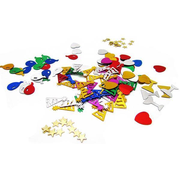 Konfety metalické rôznych tvarov - hviezdičky, srdce, poháre, balóniky. Tieto konfety slúžia k výzdobe miestností na oslavu či party.
