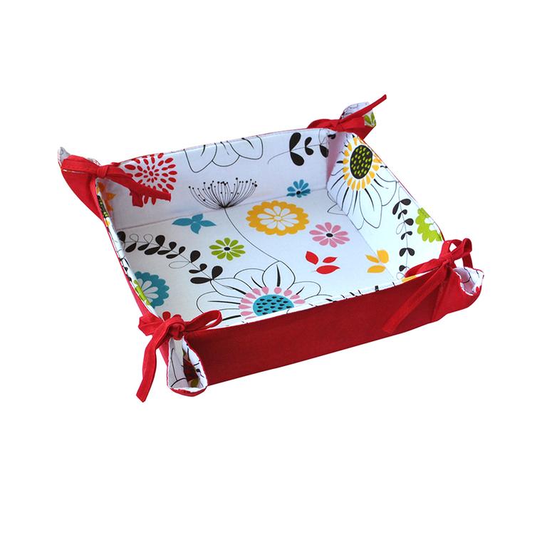 Bavlnený košík na chlieb alebo iné pečivo s motívom červených kvetov. Skvele doplní váš jedálenský stôl. Na každom rohu košíka je ozdobná mašlička. Rozmery 20 x 20 x 5,6 cm.