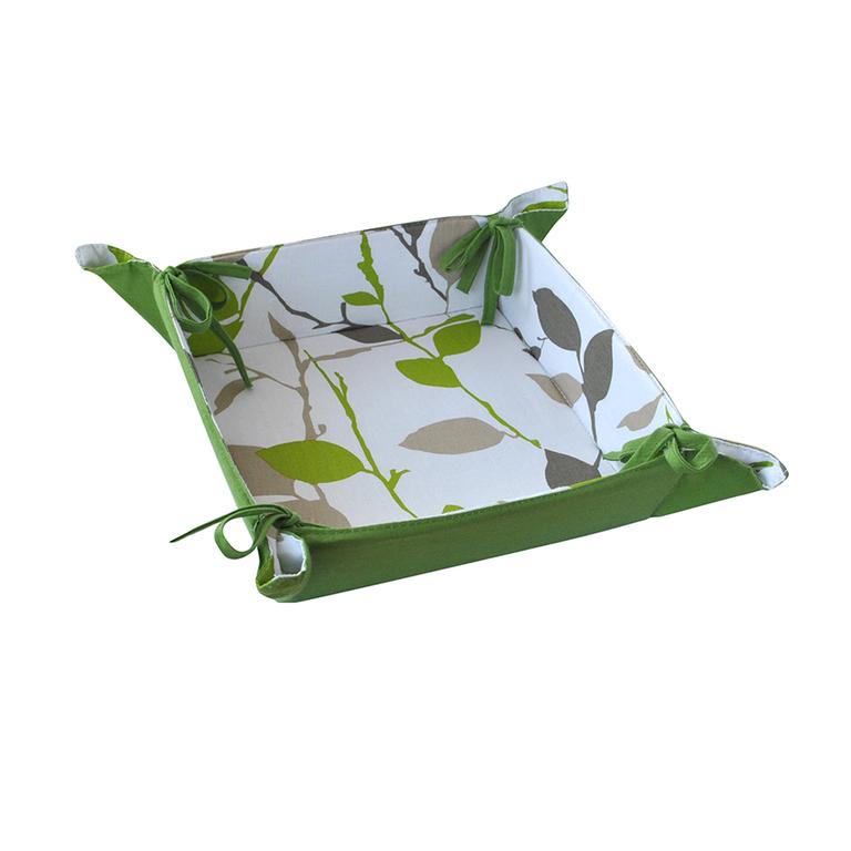 Bavlnený košík na chlieb alebo iné pečivo s motívom zelených kvetov. Skvele doplní váš jedálenský stôl. Na každom rohu košíka je ozdobná mašlička. Rozmery 20 x 20 x 5,6 cm.