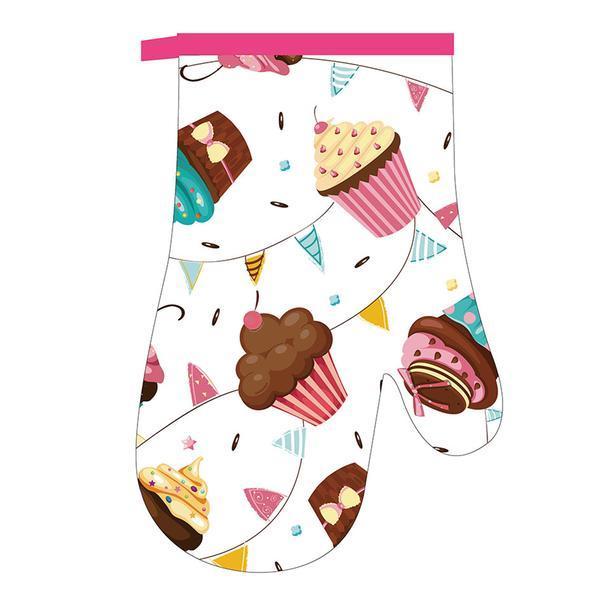 Kuchynská chňapka - tvar rukavice je vhodná pre chytenie a prenášanie horúcich nádob, plechov z rozpálenej rúry alebo na zdvihnutie rozpálenej pokrievky. Motív koláčiky. Materiál - povrch: predná strana 100% bavlna, zadná strana 100% polyester, výplň: 65% bavlna, 35% polyester. Rozmery 27 x 17 cm.