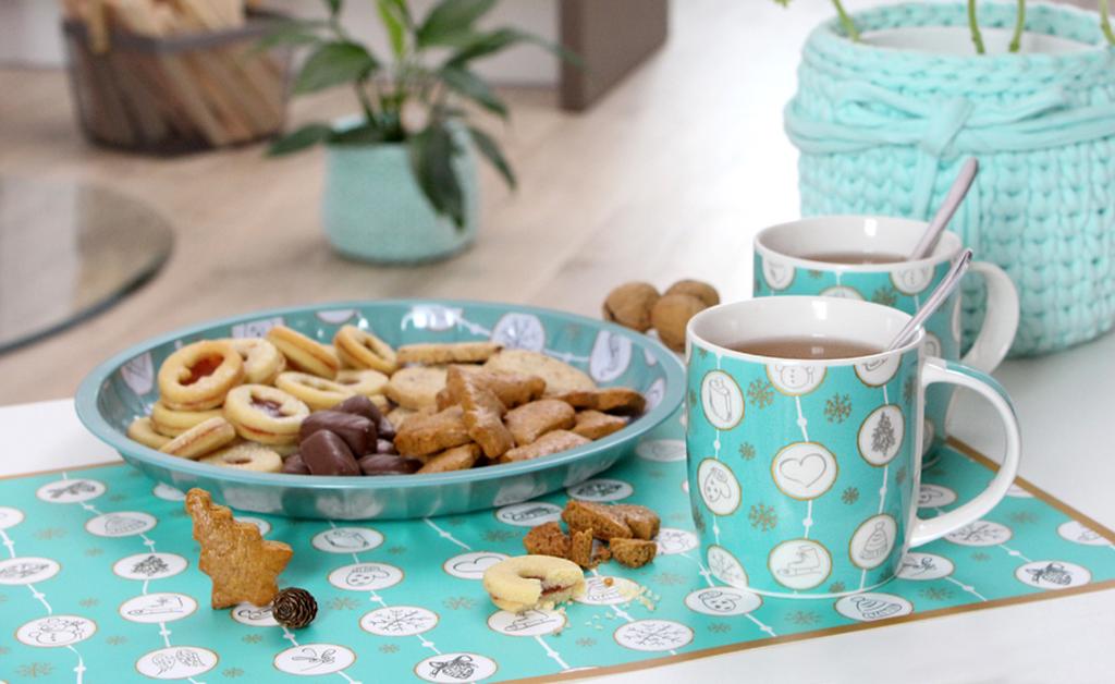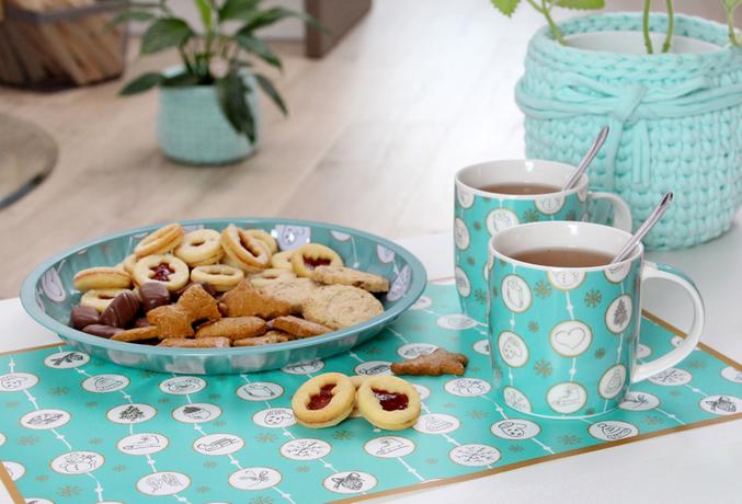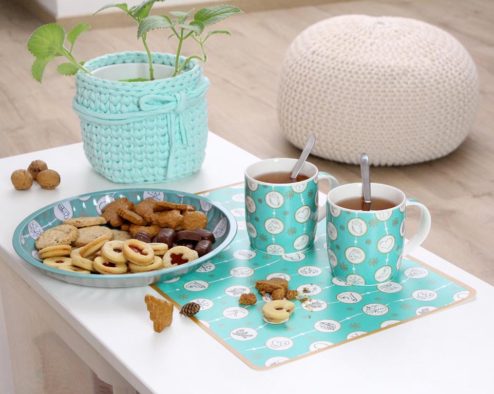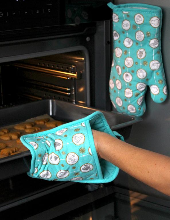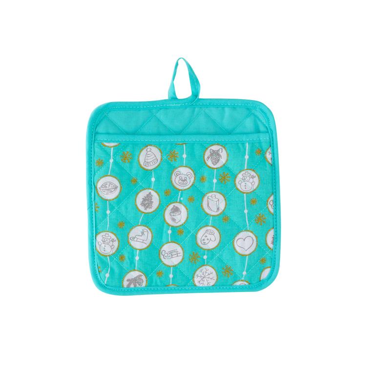 Malá vianočná chňapka tyrkysová z bavlny je vhodná na chytenie a prenášanie horúcich nádob, plechov z rozpálenej rúry alebo na zdvíhanie rozpálenej pokrievky. Rozmery 20 x 20 cm.