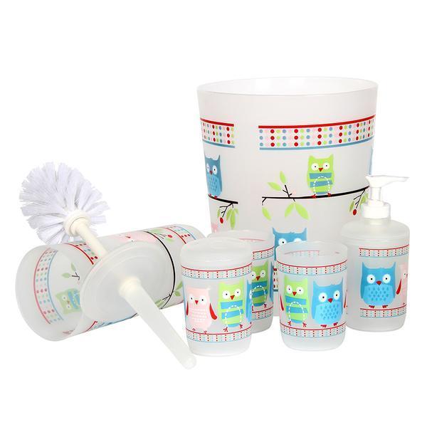 Kúpeľňová sada vyrobená z plastu, s obľúbeným motívom sovičiek. Sada obsahuje: