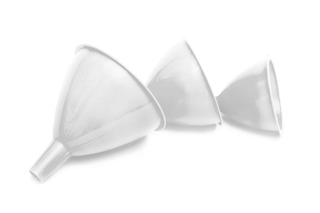 Plastový lievik slúži na prelievanie tekutín do úzkych fliaš. Vďaka výstupkom na boku sa dá zavesiť na závesnú tyč. Sada 3 ks. Farba biela. Priemer 10, 7 a 5 cm.