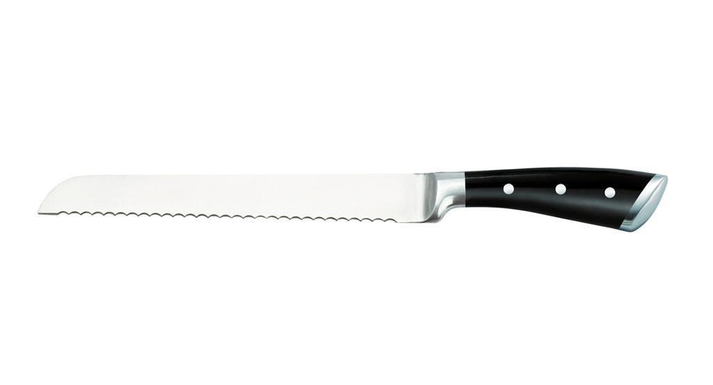 Nôž na chlieb z nového radu Provence Gourmet vás zaujme hneď na prvý pohľad. Je vyrobený z vysoko kvalitnej lesklej nerezovej ocele, protišmyková pogumovaná rukoväť je dutá s 3 nerezovými nitmi. Vďaka nej sa nôž dobre drží a nešmýka sa z ruky. Nôž na chlieb je opatrený zúbkami, slúžia na krájanie chleba a pečiva. Možno ho umývať v umývačke riadu. Dĺžka čepele 19,5 cm. Farba strieborná, čierna rukoväť.