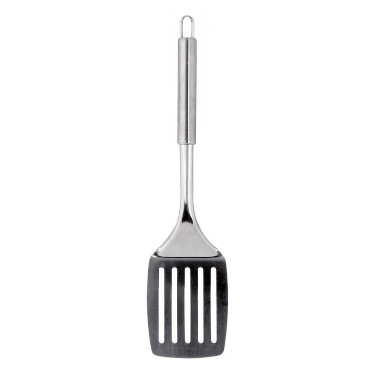Obracačka dierovaná nerezová, dĺžka 34 cm. Vyrobená z lesklej nerezovej ocele, opatrená otvorom na zavesenie, vhodná do umývačky riadu. Rozmery 34 x 8,2 x 2,5 cm. Farba strieborná.