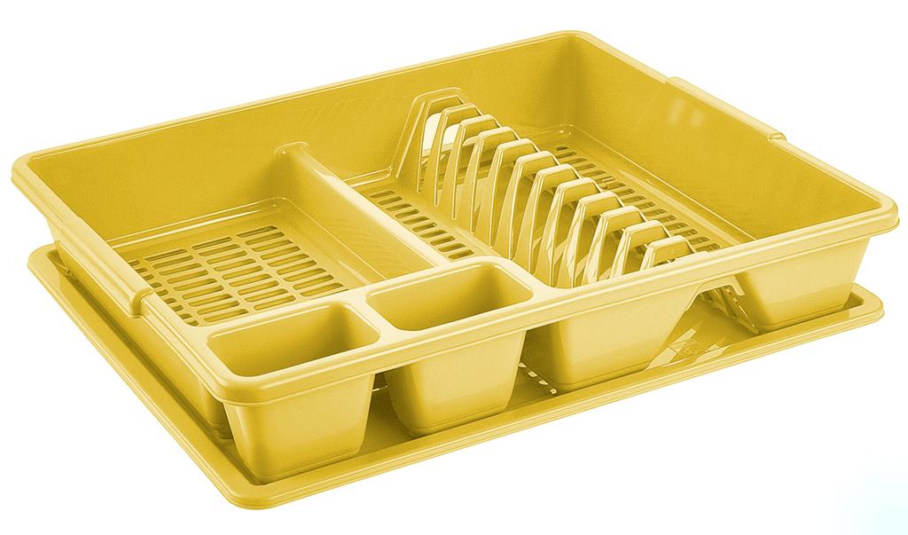 Plastový odkvapkávač s podnosom Tontarelli - veľký má dvanásť samostatných priehradiek na zachytenie tanierov a zvláštnu priehradku na príbory. Jednoduchá údržba a čistenie, tiež je vhodný do umývačky riadu. Rozmery 47 x 38 x 9 cm, farba žltá.