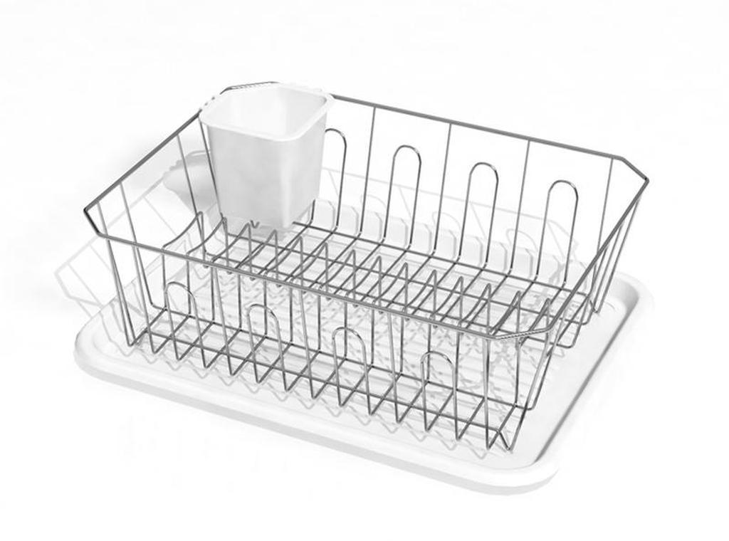 Odkvapkávač na riad je vhodný do každej kuchyne na odkladanie tanierov, riadu, príborov a ďalšieho náčinia. Vyrobený je z pochrómovaného kovu s bielou plastovou podtáckou a plastovým odkvapkávačom na príbory. Rozmer 43 x 32,5 x 13,5 cm. Farba strieborná, biela.