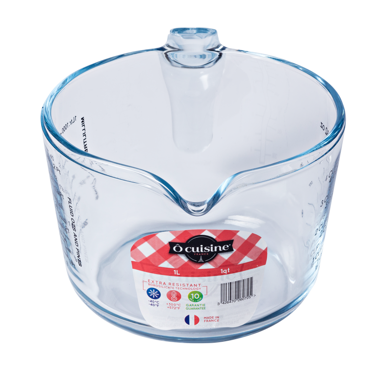 Odmerka s výlevkou, s objemom 1 l, vhodná do každej kuchyne či reštaurácie. V tejto odmerke možno zvážiť cukor do 800 g, múku do 500 g a vodu do 1 l. Vďaka materiálu je odmerka ľahko umývateľná a je vhodná do umývačky riadu. Ocuisine ponúka veľmi kvalitné kuchynské produkty, vhodné do každej kuchyne. Sklenená odmerka je vyrobená z tvrdeného borosilikátového skla, ktoré je zárukou kvality. P>