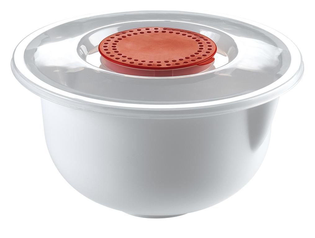 Šľahacia misa s krytom ochráni vašu kuchyňu pred znečistením pri príprave rôznych krémov, ciest atď. Táto misa vám uľahčí prácu pri varení. Unikátne riešené veko, ktoré môžete otvoriť dvoma spôsobmi - celé veko alebo iba jeho červenú vnútorná časť, ktorú potom môžete aplikovať na dno misy, aby sa vám pri šľahaní nekĺzala. Priemer 24 cm, výška 13,5 cm. P>