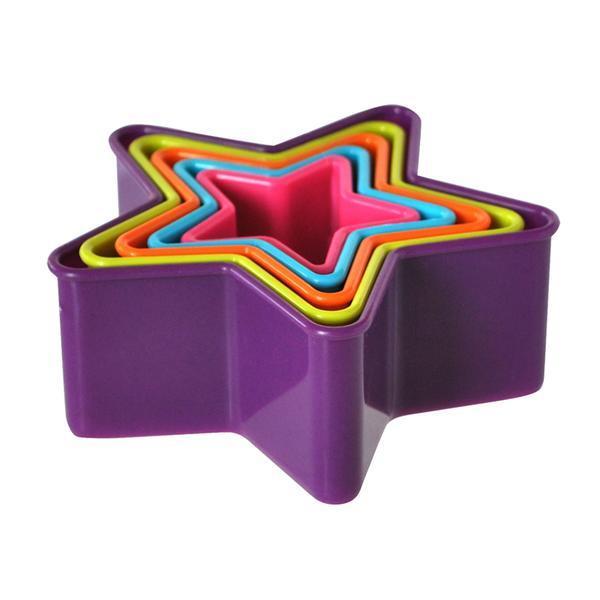 Plastové vykrajovače na cukrovinky v tvare hviezdy. V balení 5 ks - rôzne veľkosti. Assort farieb.