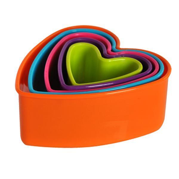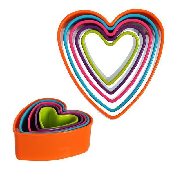 Plastové vykrajovače na cukrovinky v tvare srdca. V balení 5 ks - rôzne veľkosti. Assort farieb.