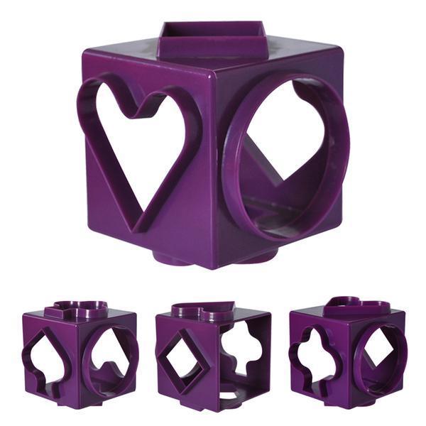 Plastové vykrajovače na cukrovinky v tvare kocky, každou ich stranou vykrojíte iný tvar - kruh, štvorec, kosoštvorec, srdce, 2 rôzne tvary stromu. Rozmery - 7,5 x 7,5 x 7,5 cm.