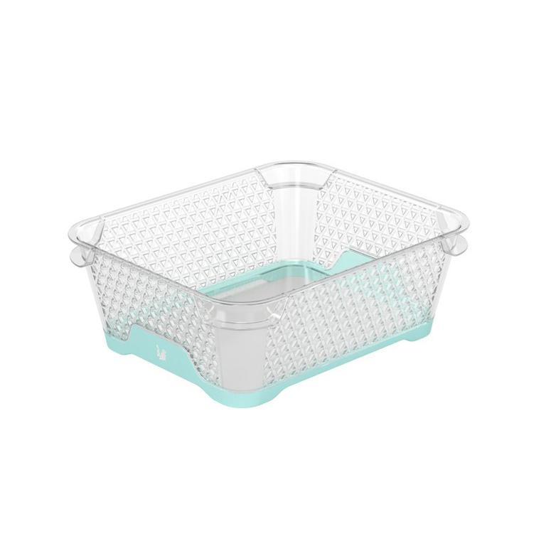 Víceúčelový košík střední s barevným protiskluzovým dnem lze použít kdekoliv v domácnosti nebo kanceláři. Vnitřní rozměr odpovídá formátu A6, je tedy vhodný pro ukládání papírů. Košík je stohovatelný. Materiál - plast, dno je z pogumovaného plastu. Rozměry - 20 x 16 x 7 cm. Barva transparentní/mořská modrá.
