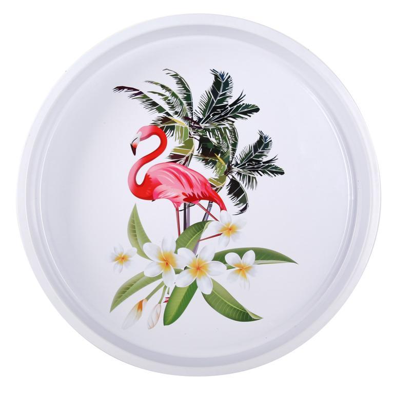 Plechový servírovací podnos s moderným a obľúbeným motívom plameniakov. Podnos je vhodný na servírovanie nápojov a pokrmov. Priemer 33 cm, výška 2 cm. Assort motívov plameniakov.