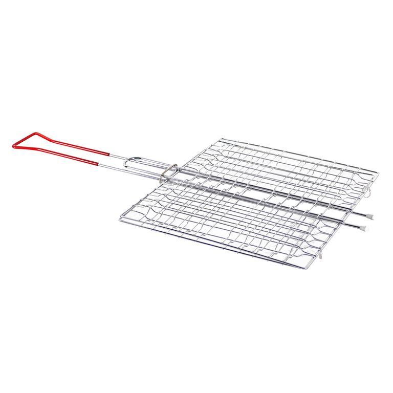 Dvojitý obdĺžnikový grilovací rošt vhodný pre grilovanie steakov, plátkov mäsa, klobás, atď. Rošt uľahčuje obracanie a manipuláciu počas grilovania. Použitie: pre krby, grily a ohnisko. Rozmery roštu: grilovacia plocha - 27 x 24 cm, celková dĺžka roštu 52 cm. Materiál - pochrómovaný kov.