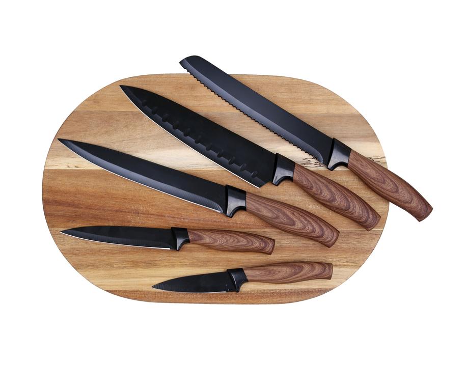 Sada nožov PROVENCE Exclusive obsahuje 5 ks najpoužívanejších nožov. Nože majú ergonomickú rukoväť s imitáciou dreva, ostrú čepeľ s nepriľnavým povrchom. Sú vysoko odolné a ľahko sa čistia. Sada obsahuje 5 ks nožov: kuchársky nôž: široká, špicatá čepeľ určená na sekanie, krájanie na kocky či plátky a na drvenie, nôž na chlieb: zúbkovaná alebo zvlnená čepeľ, ktorá si ľahko poradí s tvrdou kôrkou i mäkkou striedkou, porcovací nôž: úzky nôž s dlhou čepeľou a ostrou špičkou určený na krájanie a porcovanie mäsa , univerzálny nôž: kvalitný viacúčelový nôž vhodný na krájanie a orezávanie mäsa či veľkých kusov zeleniny, lúpací nôž: malý špicatý nôž na ovocie a zeleninu.