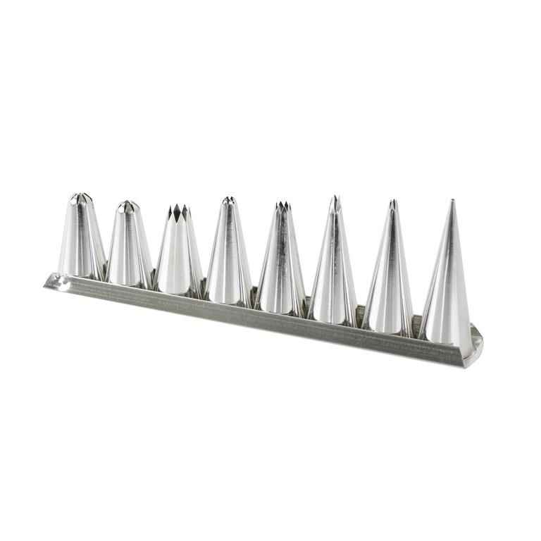 Sada 8 ks rôznych zdobiacich špičiek k cukrárskemu vrecku. Vhodné na zdobenie toriet a iných sladkých pokrmov. Vyrobené z pocínovaného plechu. Vhodné tiež na písanie rôzneho textu na cukrovinky.