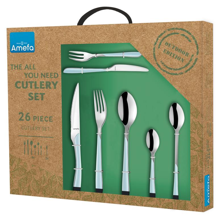 Moderná súprava príborov Amefa Eclat Matt obsahuje 26 kusov z nerezovej ocele 18/0 so svetlomodrou rukoväťou. Príbory sú vyrobené z chrómniklovej ocele, ktorá im zaisťuje vysokú odolnosť proti korózii a lesklý zrkadlový povrch. Všetky možno umývať v umývačke riadu. Príbory Amefa urobia z každého stolovania osobitnú príležitosť a budú sa skvele dopĺňať s ostaným prestieraním.