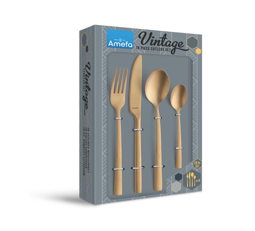 Sada príborov Amefa Manille z vysoko kvalitnej nehrdzavejúcej ocele, vďaka ktorej bude vaše stolovanie zase o trochu príjemnejšie. V kazetovom balení nájdete jedálenské nože, vidličky, lyžice a lyžičky po štyroch kusoch, v zlatom farebnom prevedení. Nie je možné umývať v umývačke riadu.
