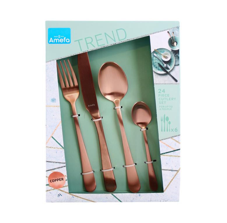 Sada 24 ks príborov AUSTIN je vyrobená z prvotriednej nehrdzavejúcej ocele 18/0, kazetové balenie obsahuje 6 jedálenských nožov, 6 vidličiek, 6 polievkových lyžíc a 6 kávových lyžičiek. Kvalitný príbor pre každodenné použitie v nevšednom modernom dizajne štýl, Vintage, matné prevedenie. Vhodné do umývačky riadu. Farba medená.