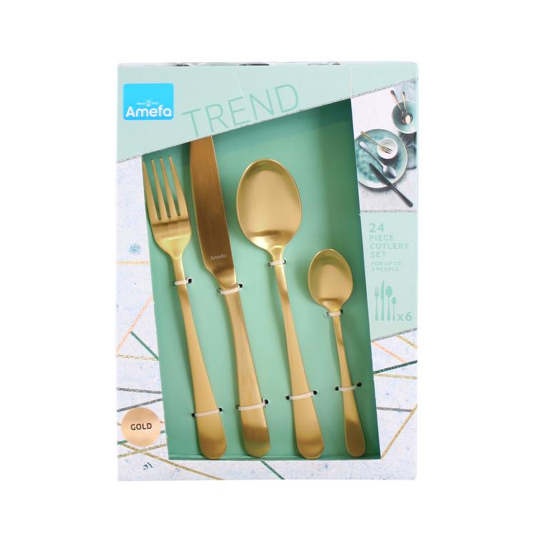 Sada 24 ks príborov AUSTIN je vyrobená z prvotriednej nehrdzavejúcej ocele 18/0. Kazetové balenie obsahuje 6 jedálenských nožov, 6 vidličiek, 6 polievkových lyžíc a 6 kávových lyžičiek. Kvalitný príbor na každodenné použitie v nevšednom modernom dizajne, štýl Vintage, matné prevedenie. Vhodné do umývačky riadu. Farba zlatá.