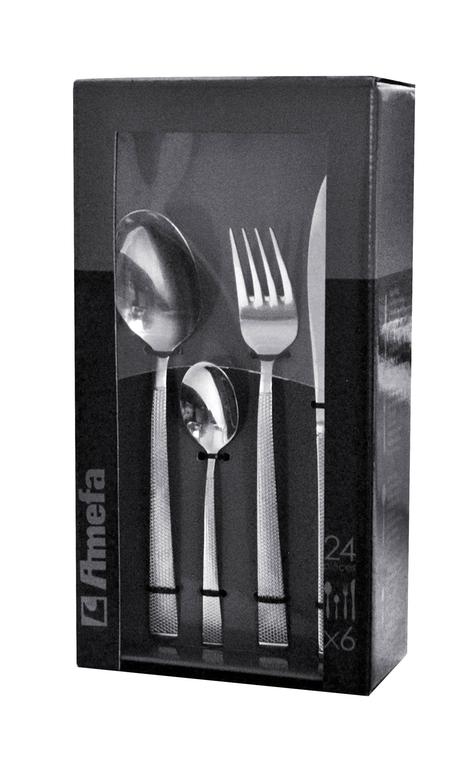 Súprava príborov Parure je vyrobená z kvalitnej nehrdzavejúcej ocele a je novinkou firmy Amefa. Kazetové balenie obsahuje 24 ks - 6 jedálenských nožov, 6 vidličiek, 6 polievkových lyžíc a 6 kávových lyžičiek. Vhodné do umývačky riadu.