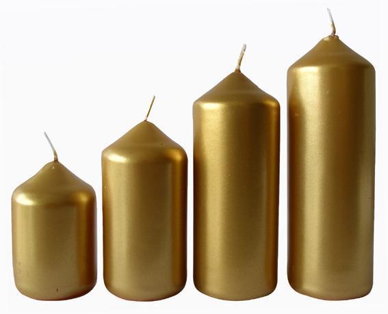 Nezabudnite, prosím, dbať na bezpečnosť a držte sa na sviečke uvedených bezpečnostných piktogramov. Materiál parafín. Balenie 4 ks. Priemer sviečok je 4 cm. Výška jednotlivých sviečok je: 6,5; 8,5; 10 a 12 cm. Farba zlatá.