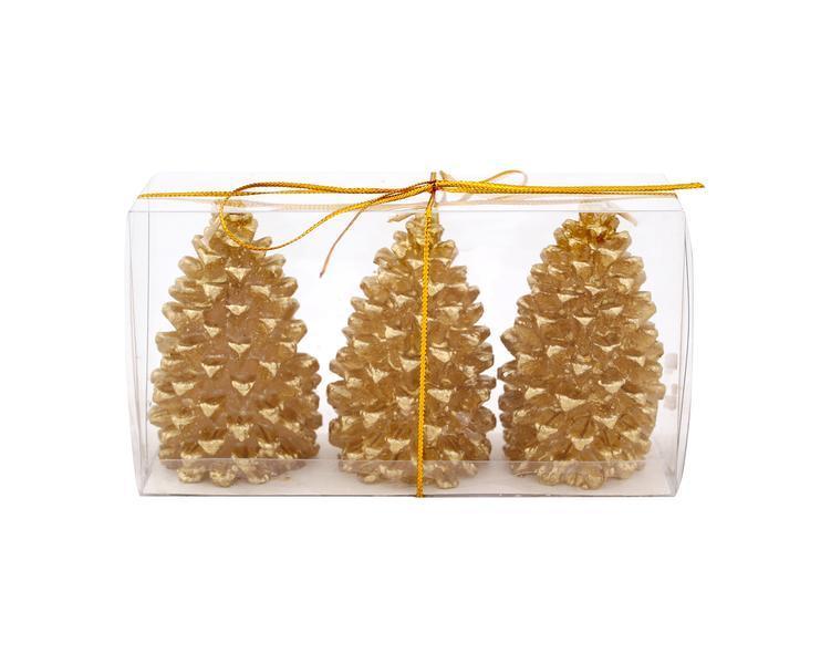 Sada 3 ks vianočných sviečok v tvare šišky. Hodia sa na každý vianočný stôl, kde navodia tú pravú sviatočnú atmosféru. Materiál - parafín. Farba zlatá.