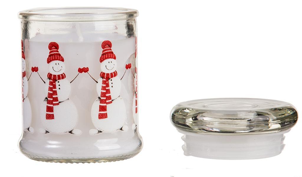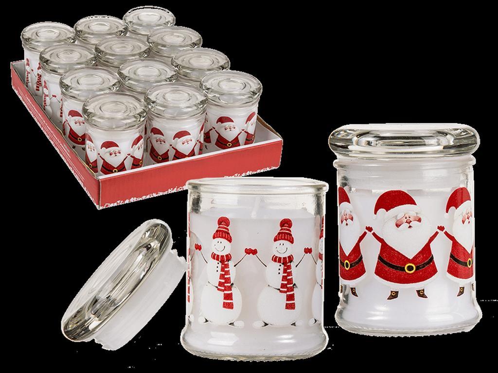 Sviečka v skle s viečkom. Táto sviečka navodí tú správnu vianočnú atmosféru. Vhodná tiež ako darček. Rozmery 8 x 6 cm. Assort motívov - Santa Claus alebo snehuliaci. Farba červeno-biela.