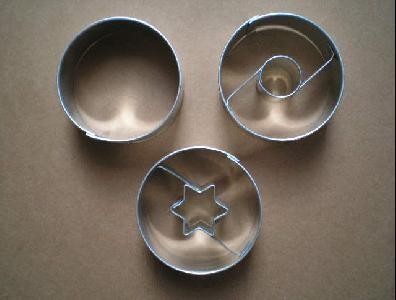Sada formičiek 3 ks - tvar hladké kolieska. Vhodné na cukrovinky, medovníčky, poťahové alebo modelovacie hmoty. Vykrajovače sú od českého výrobcu a spĺňajú všetky predpísané normy. Vyrobené z pocínovaného plechu. Obsah balenia: 1x koliesko plné, 1x koliesko s okrúhlym stredom, 1x koliesko s hviezdičkovým stredom. Priemer 4 cm.