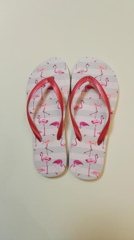 Dámske žabky s veľmi obľúbeným motívom "Plameniaky". Žabky sú pohodlná obuv na horúce letné dni, k vode, ale aj na bežné nosenie. Veľkosť EU 40. Dĺžka 26,6 cm. Assort farieb.