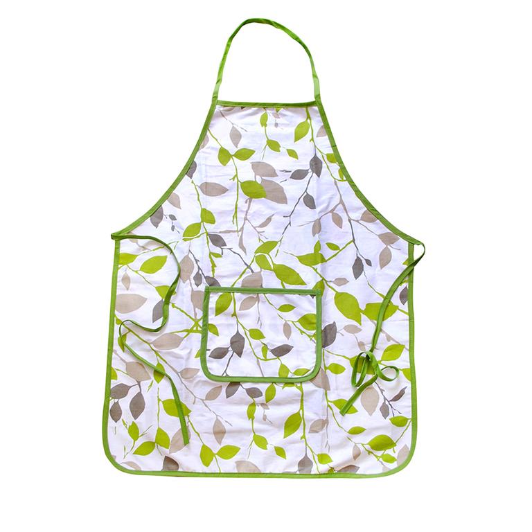 Kuchynská zástera s motívom zelených kvetov vyrobená zo 100% bavlny. Variant obopínajúcej zástery s náprsenkou, vpredu opatrená vreckom. Možno prať na 30 °C. Rozmer zástery 60 x 74 cm.