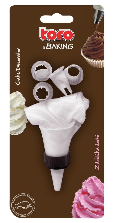 Zdobička toriet sa skladá z dávkovača a štyroch rôznych nástavcov. Vhodné na prípravu sušienok a zdobenie toriet. Materiál - plast, plátno. Objem dávkovača je 1200 ml. Veľkosť nástavca - 2,5 cm.